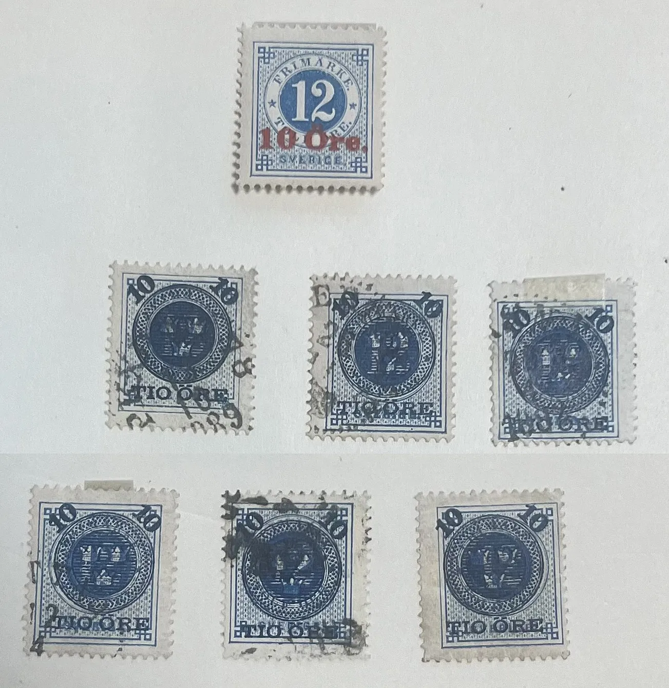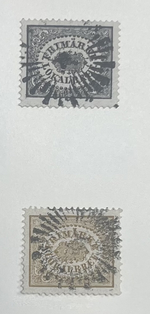 Samling stämplade märken Vapen, fina svart och brun Lokal, Ringtyp i nyanser och några spegeltryck, 10 på 12 öre privat påtryck och BC/CB-par mm.